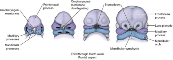 separated from primordial pharynx by oropharyngeal membrane (ruptures around day 26)