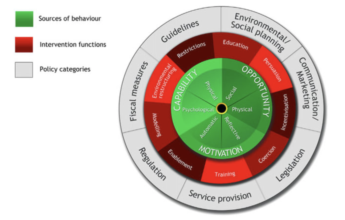 COM-B Wheel = 9 intervention functions and 7 categories of policy (on basis of the COM model)