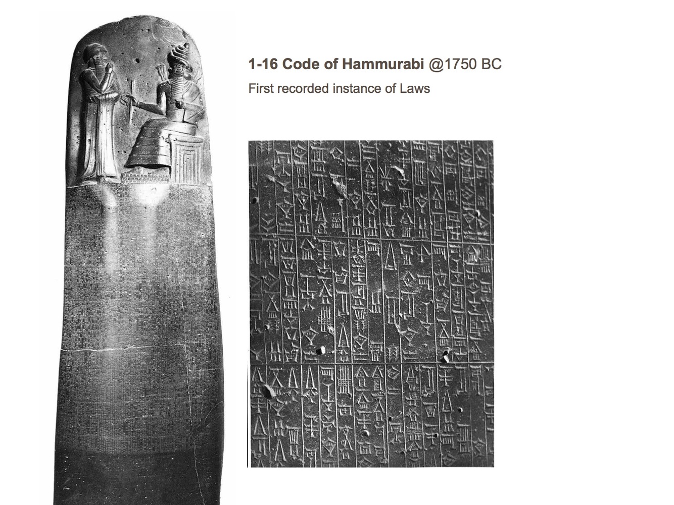 Code of Hammurabi, 1750 BC First recorded instance of Laws