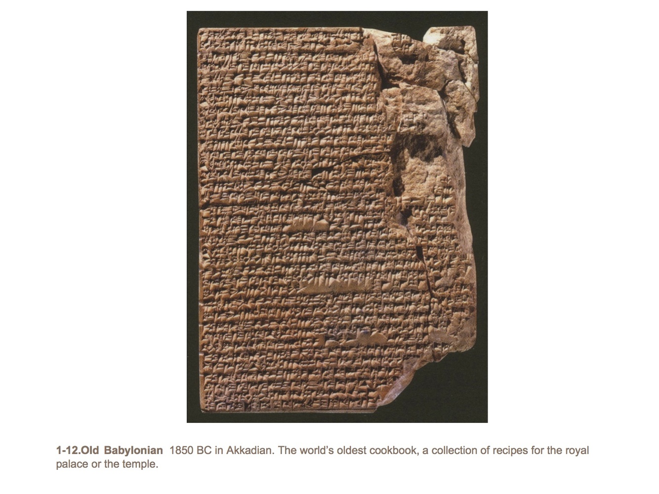 Old Babylonian 1850 BC in Akkadian. The world’s oldest cookbook, a collection of recipes for the royal palace or the temple.