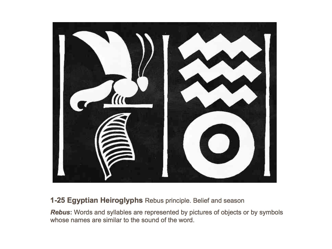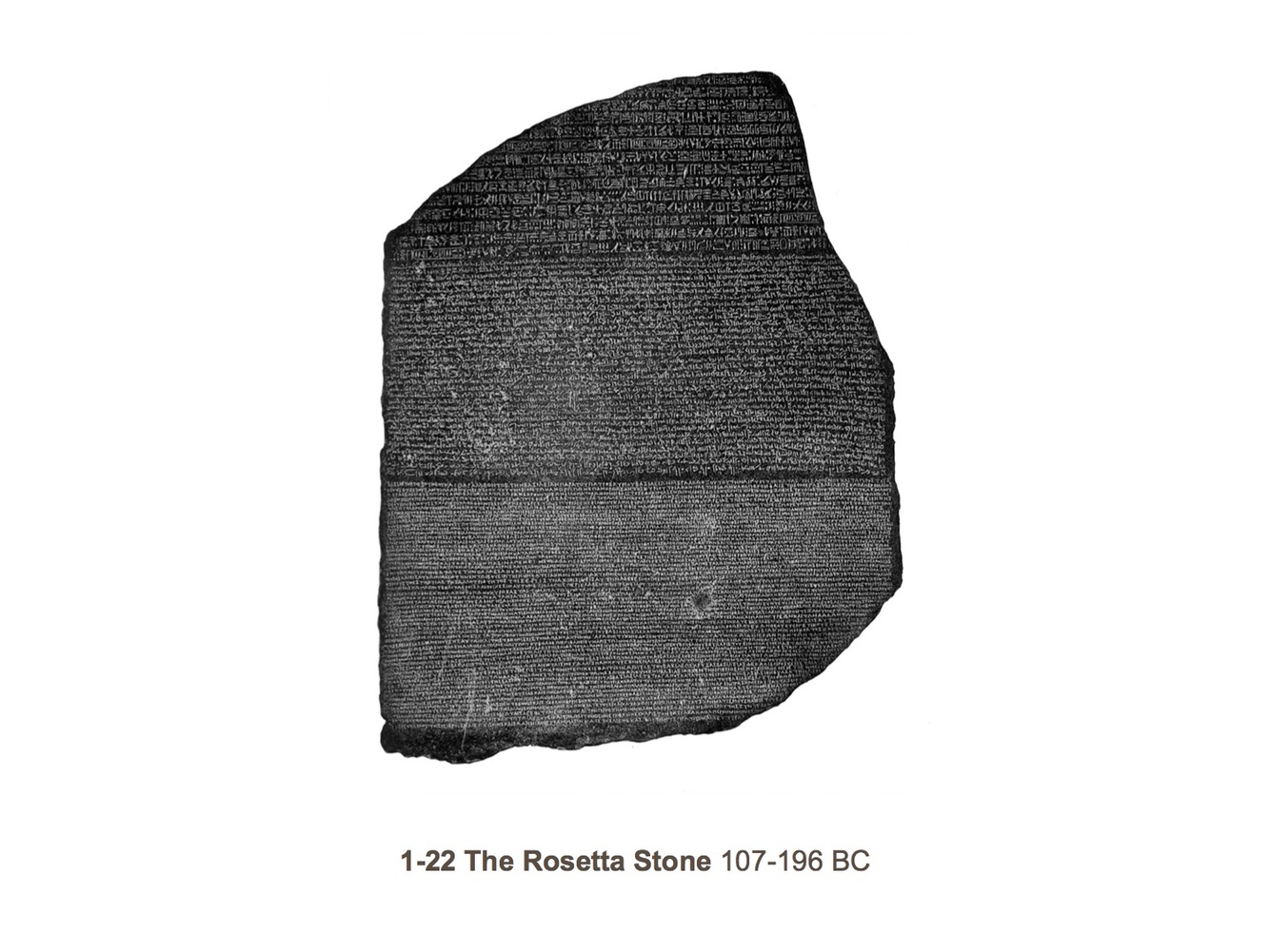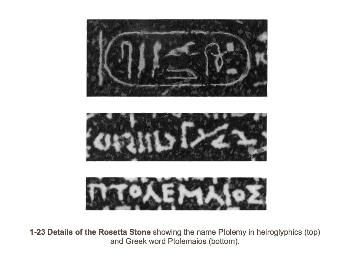 Details of the Rosetta Stone showing the name Ptolemy in heiroglyphics (top) and Greek word Ptolemaios (bottom).