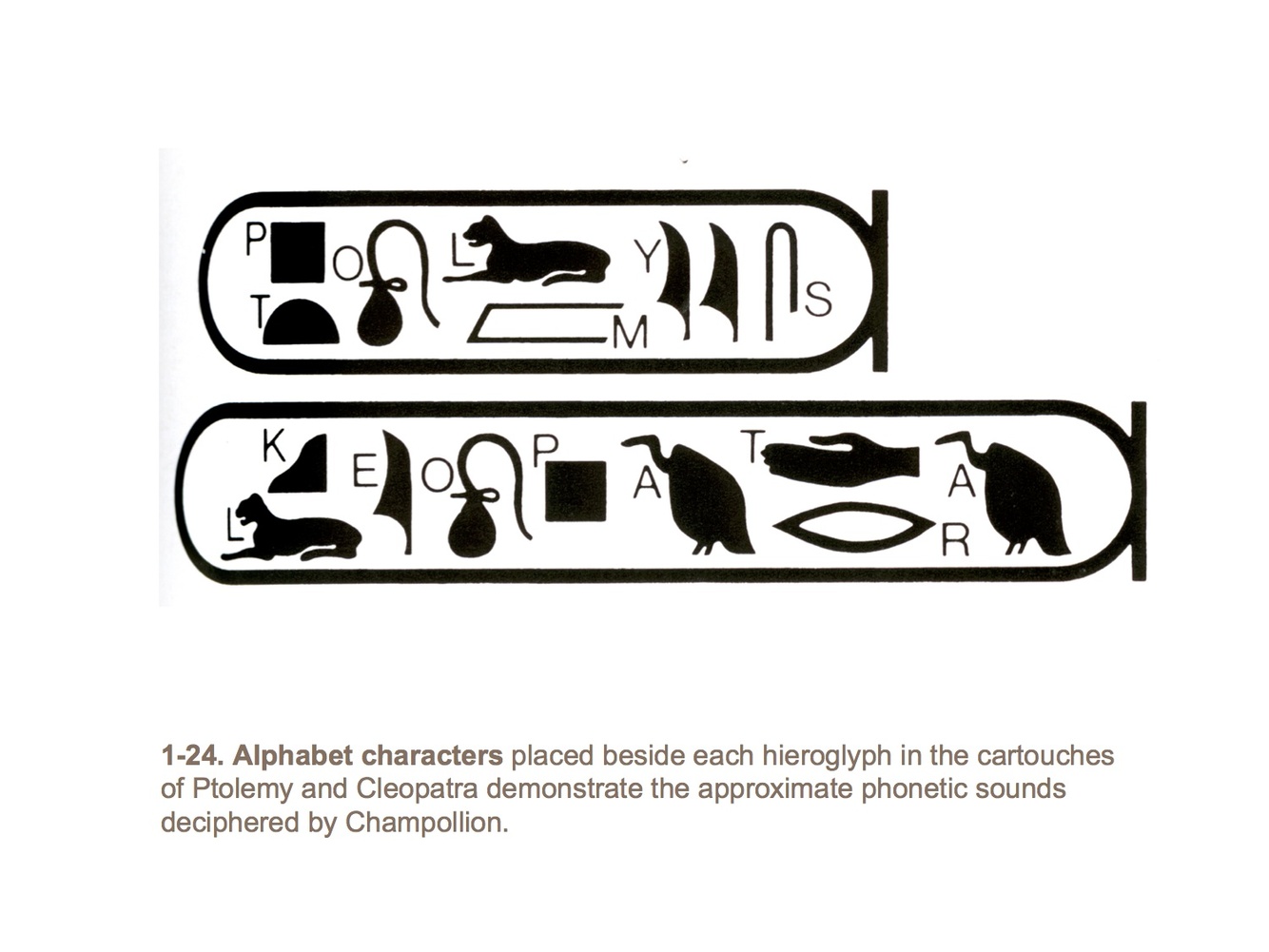 Alphabet characters placed beside each hieroglyph in the cartouches of Ptolemy and Cleopatra demonstrate the approximate phonetic sounds deciphered by Champollion.