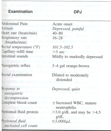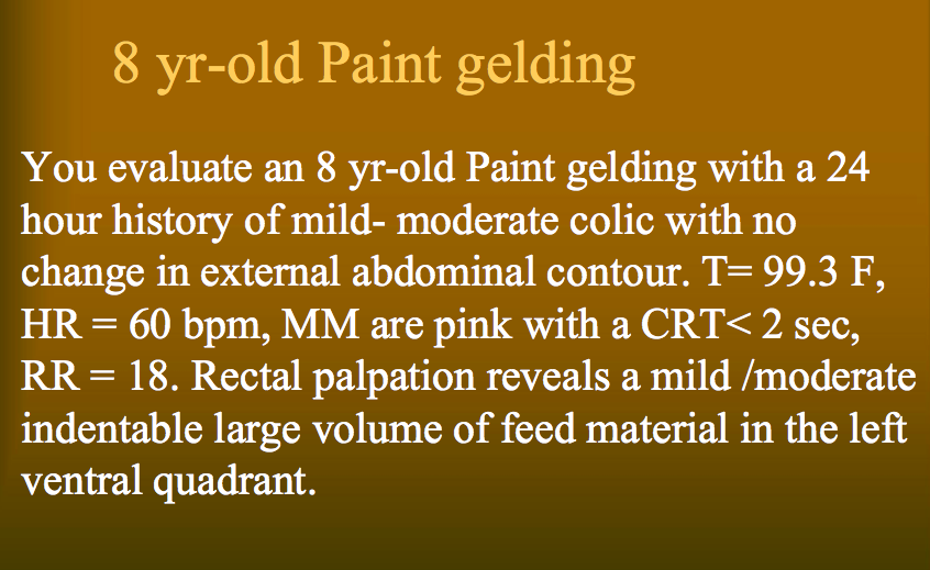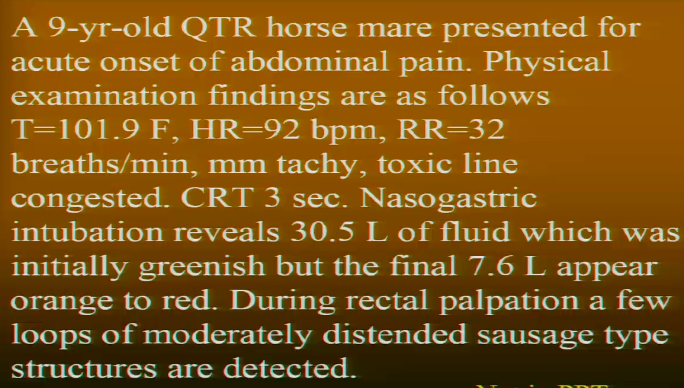 After Gastric Decompression the Horse is in Less Pain. 100 mg Xylazine is Administered. The Mare stays relatively Pain Free for 30 Min. Pain Increases Again and another 9.5 L of Reflux is Obtained. The Mare is Administered another 100 mg of Xylazine which keeps her Comfortable for longer. It is 1 Hour later that she is Refluxed again, 10L reflux Obtained. The Mare is Progressively Depressed. Analysis of the Peritoneal Fluid is Obtained by Abdominocentesis reveals Serosanguinous TP = 4.5 g/dL, WBC = 11,600