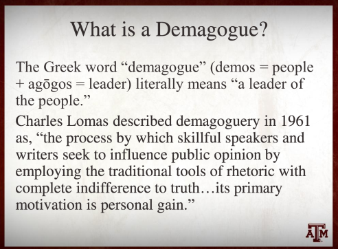 A political leader who seeks support by appealing to popular desires and prejudices rather than by using rational argument.