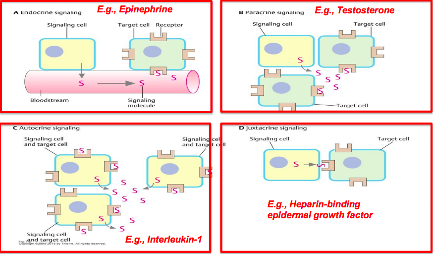 Endocrine: signaling molecule released by a cell distant to target and transported via bloodstream to target. i.e., epinephrine