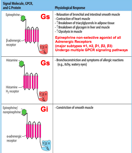 Epinephrine, histamine, and NE bind to what type of receptors, activating which GPCR pathways?