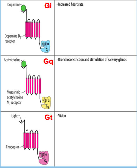Dopamine, ACh, and light bind to what receptors utilizing which GPCR pathway?