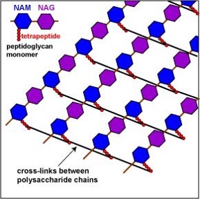It’s repeating monomers of NAM and NAG with tetrapeptides that are cross lined together to form a wall.