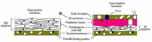 Gram negative bacteria have a cytoplasmic membrane, a thinner peptidoglycan layer, then periplasmic space and an outer envelope membrane with LPS