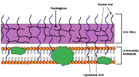 THere is a cytoplasmic membrane covered with a thick layer of peptidoglycan. Through the peptidoglycan there is teichoic acid. Some of the teichoic acid will stick down into the membrane (lipoteichoic acid), and other teichoic acid will project to the outside of the peptidoglycan.