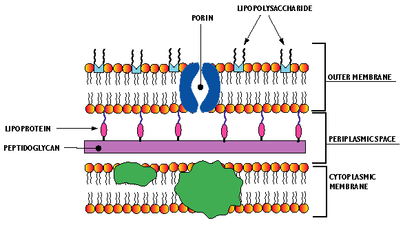 Gram negative cells have a cytoplasmic membrane covered by a thin peptidoglycan layer. Beyond the peptidoglycan there is another outer membrane that is separated by the peptidoglycan by a gel-like periplasmic space. The outer leaflet of the outer membrane contains lipopolysaccharide. Since the outer membrane is much less permeable than the cytoplasmic membrane, porin proteins are placed through the membrane to allow nutrients to pass through.