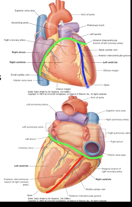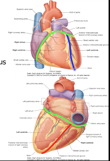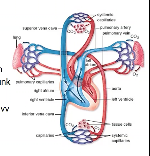 Describe the circulation of blood in the body with relation to where blood is received from & sent to from the 4 cambers of the heart