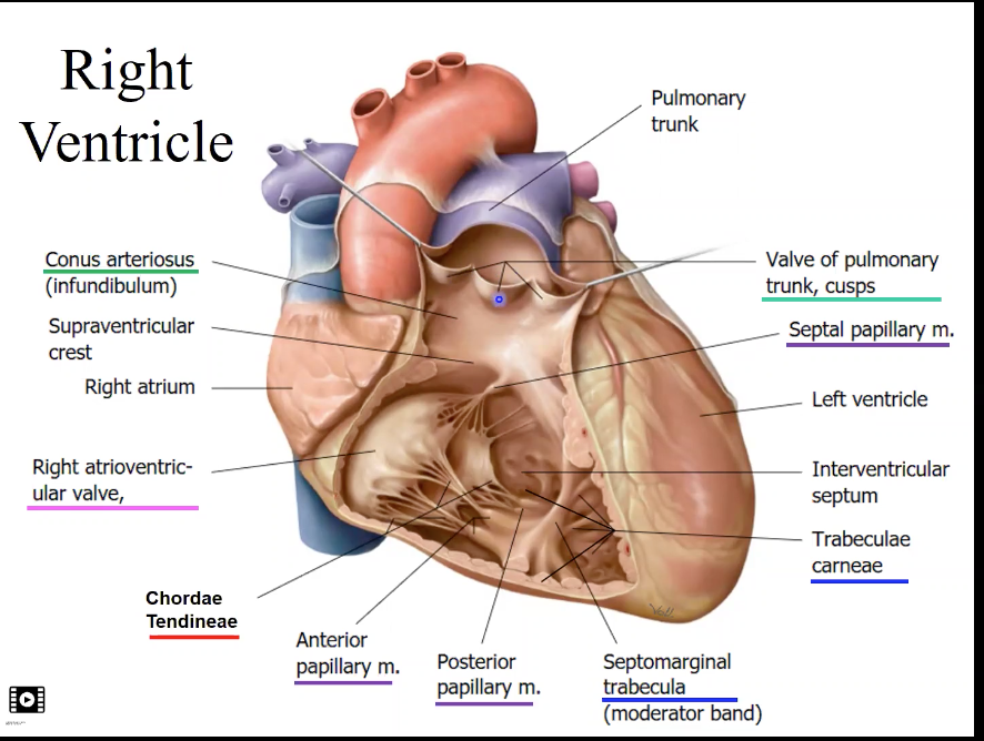 What are the two sections of the right ventricle? Openings & important characteristics?