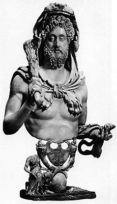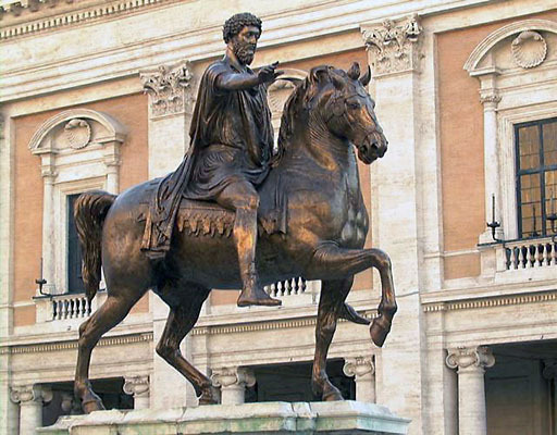 Depiction of a victorious general on horseback displaying power to destroy and mercy. He was a general and a philosoper. Has the philosophers beard compared to the stubble of a soldier.