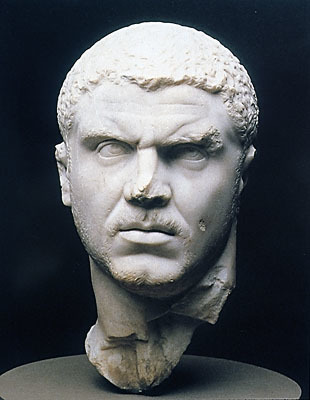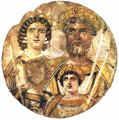 Rare painted portrait supporting family values and peace to Rome. Severus keeps continuity with Marcus Arielius’s philosopher beard to make up for lack of bloodline. Child’s face is scratched out.
