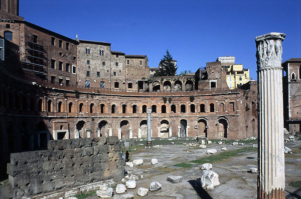 Quoting Augustus in portrait and in forum. Large open plaza, semi circular wings, traditional. Glorified Trajan’s victories agains the Dacians and military prowess (equestrian statue). Built with the spoils from campaigns.
