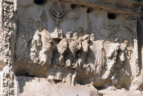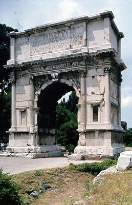 Triumphal arch commemorating Titus. Features winged Victories and parades returning from campaign with spoils. Classical style of Ara Pacis was rejected.