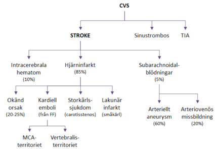 Ungefär 85% av alla stroke utgörs av hjärinfarkter, vanligen pga ateroskleros eller hjärtsjukdom. 10% är intracerebrala hematom. Resten utgörs av subarachnoidalblödningar och andra mer ovanliga CVS-former.