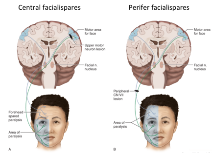 Pares betyder nedsatt styrka i muskler, så detta är alltså påverkan på ansiktets muskler. Facialismusklen går från övre motoriska området för att sedan gå ner för överkosrning i Nucleus facialis som ligger i pons. Beroende på var skadan ligger så brukar man dela upp det i två olika former: