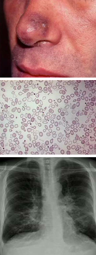 A 68 year old patient with HIV has CD4 count of 100 and a viral load of 100. He has had HIV for 30 years. He has the skin lesion below, chronic cough and fatigue. His peripheral blood smear and CXR are shown below. What is causing his symptoms?