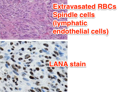 DNA virus HHV-8 is present in 100% of Kaposi sarcomas. You need to biopsy to differentiate from bacillary angiomatosis.