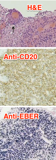 Diffuse Large B Cell Immunoblastic Lymphomas are the most common cause of primary CNS lymphoma in patients with HIV. These are always EBV+ and have a poor prognosis. Tx with ARTs, radiation, high dose MTX w/leucovorin rescue, temozolomide and rituximab (Anti-CD20) followed by ARA-C with etoposide.