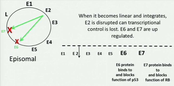 When cellular and humoral immunity are compromised, HPV is persistent and is more likely to go from an episomal DNA to DNA integrated with the host cell (because loss of E2 = expression of E6 and E7 block p53 and Rb respectively)