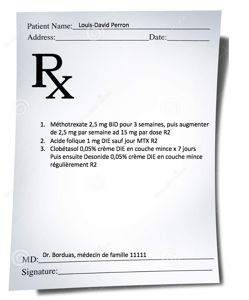 Louis-David, 28 ans, se présente à votre pharmacie avec une nouvelle ordonnance (voir en pièce-jointe). Il sort tout juste du bureau de médecin où un diagnostic de psoriasis sévère a été posé. Il avait déjà tenté des traitements topiques par le passé, sans succès.