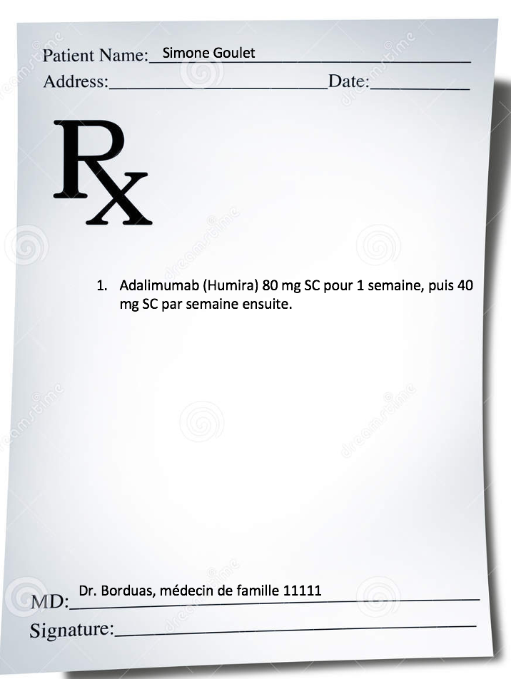 I. Les thérapies biologiques sont des choix de première intention dans le traitement de l’arthrite psoriasique. Le MTX est aussi un choix adéquat, mais considérant la consommation d’alcool de Mme. Goulet, ce choix n’était pas applicable ici. Cependant, la posologie de l’Humira est inadéquate sur l’ordonnance. En effet, ce médicament s’adminsitre aux 2 semaines lors de l’introduction, et non à chaque semaine.