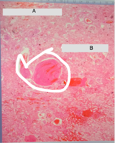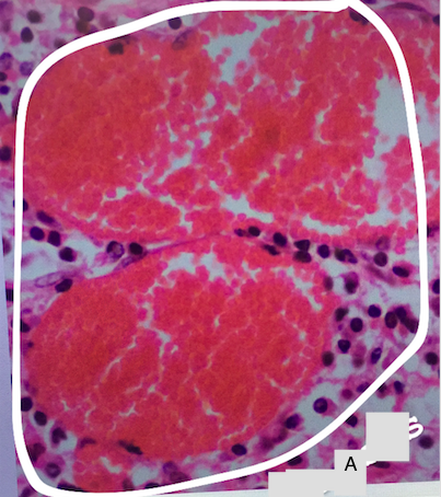 macrophages will come in and eat up all the RBC and this will cause hemosiderin which is the brown and gold pigment