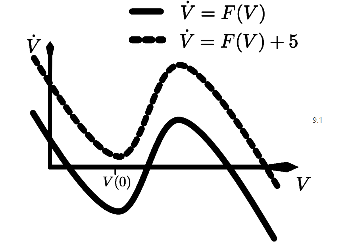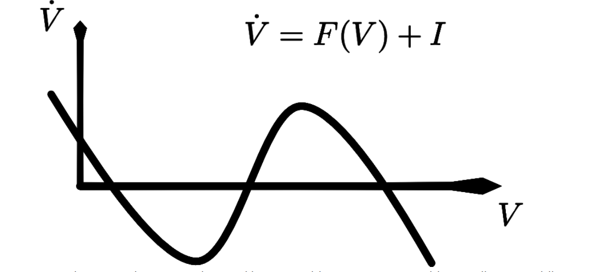 Consider a neuron model whose membrane potential is governed by the differential equation in the graph below.