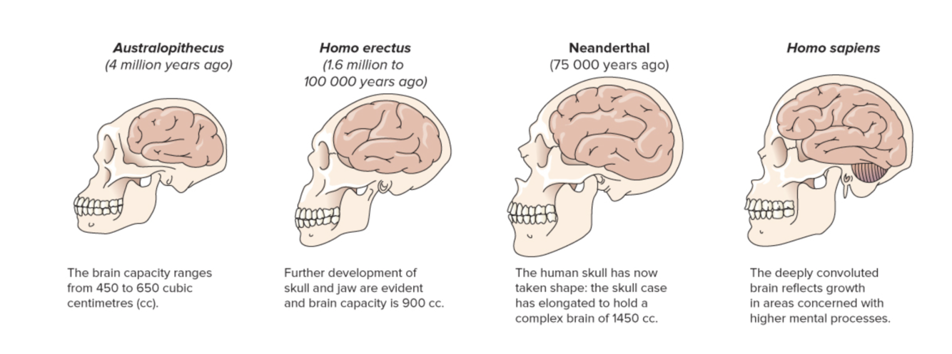modern brain is smaller but change happened was proportion and functionally and lead to higher brain areas