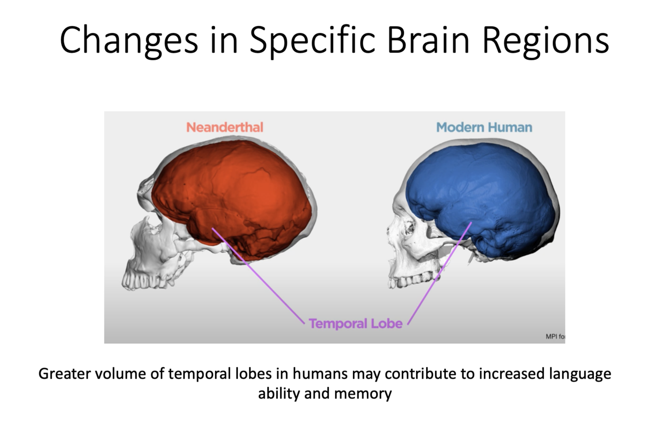 What are some of the possible changes seen in the human brain between the neanderthal and the modern brain?