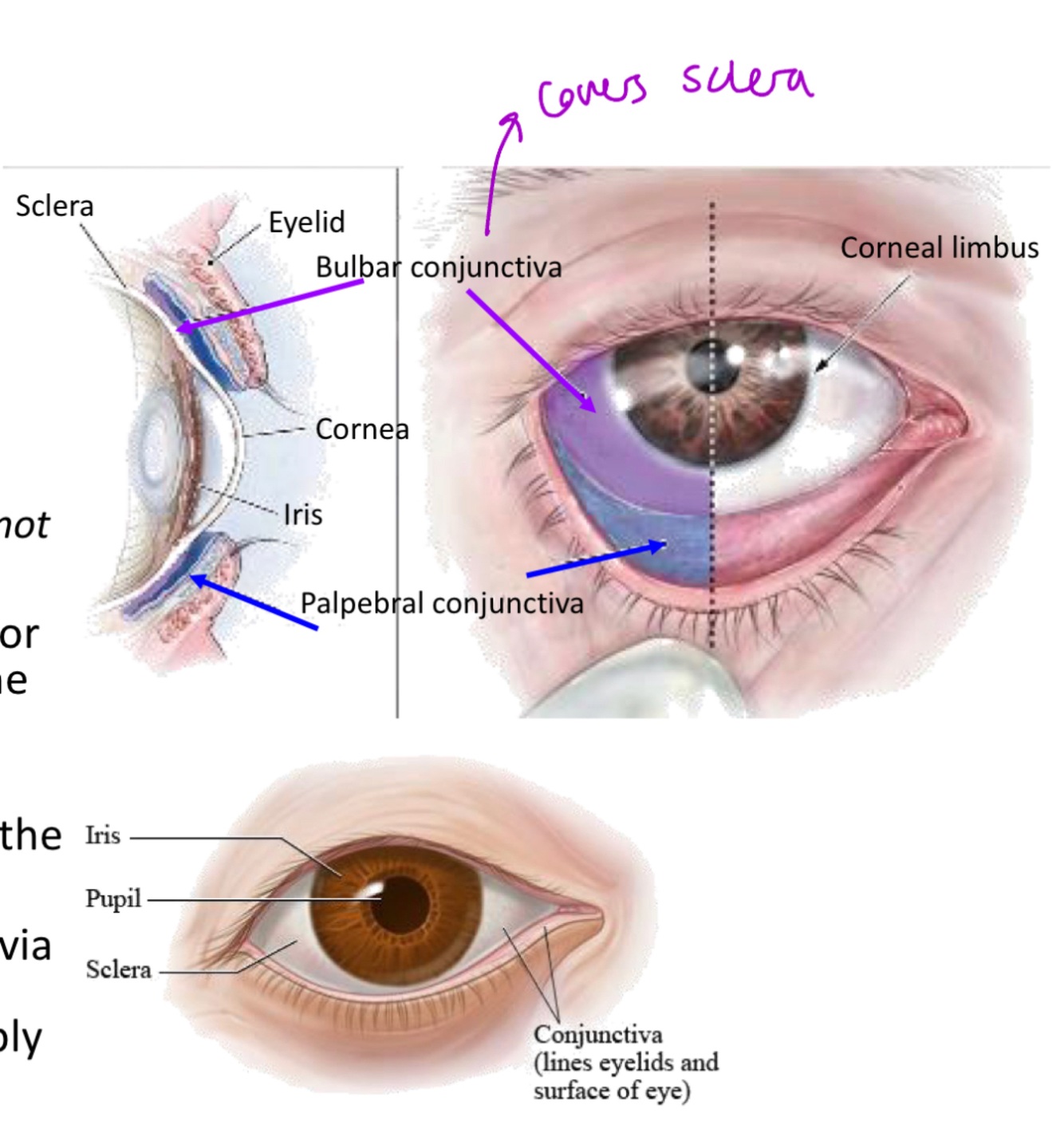 what is the anatomical location of the conjunctiva and what is it attached to?
