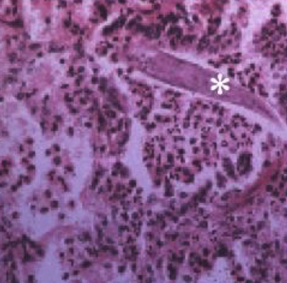 Dictyocaulus viviparus larvae in lung with inflammatory cells (eosinophils)