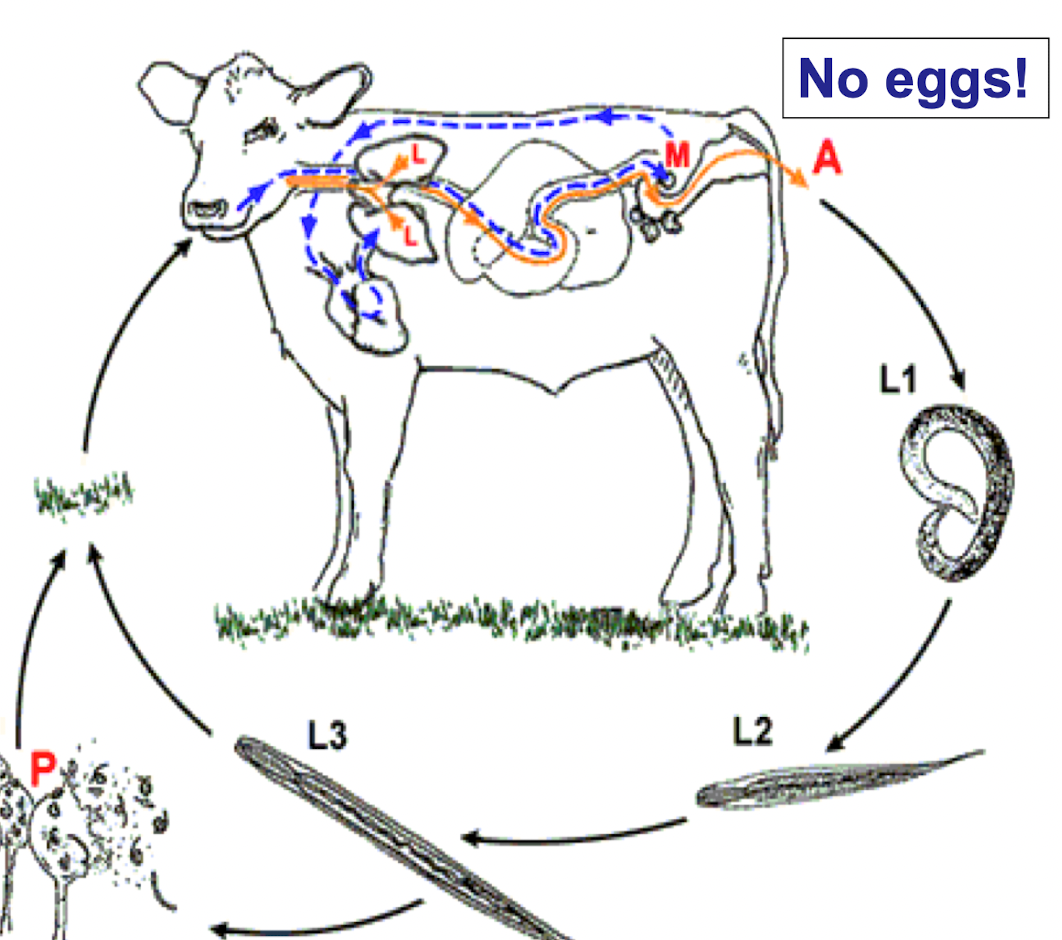 Dictyocaulus viviparus- exception- no eggs, lung worm- pilobolus fungi spread
