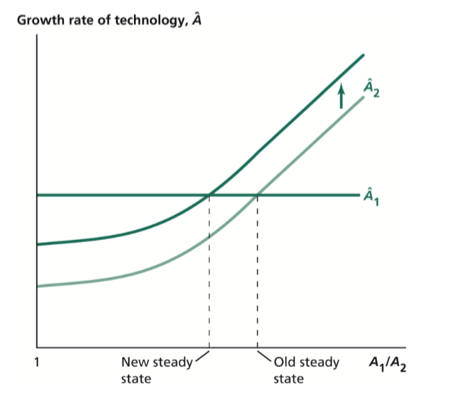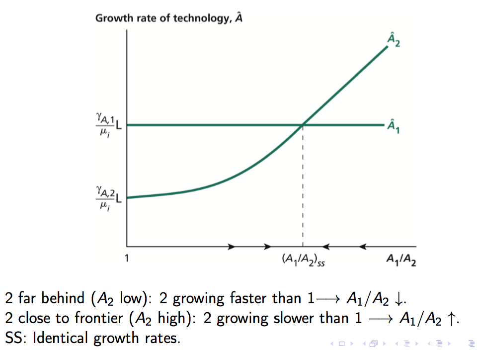 γA2 ↑ → 2 growing faster → imitation costlier → growth slows until Aˆ1 = Aˆ2 .
