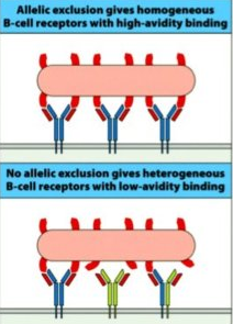 So for example you have a yellow bunny mating with a blue bunny - their offspring can make either blue or yellow - but for each b cell it only chooses one - doesn’t mix them up - thats allelic exclusion