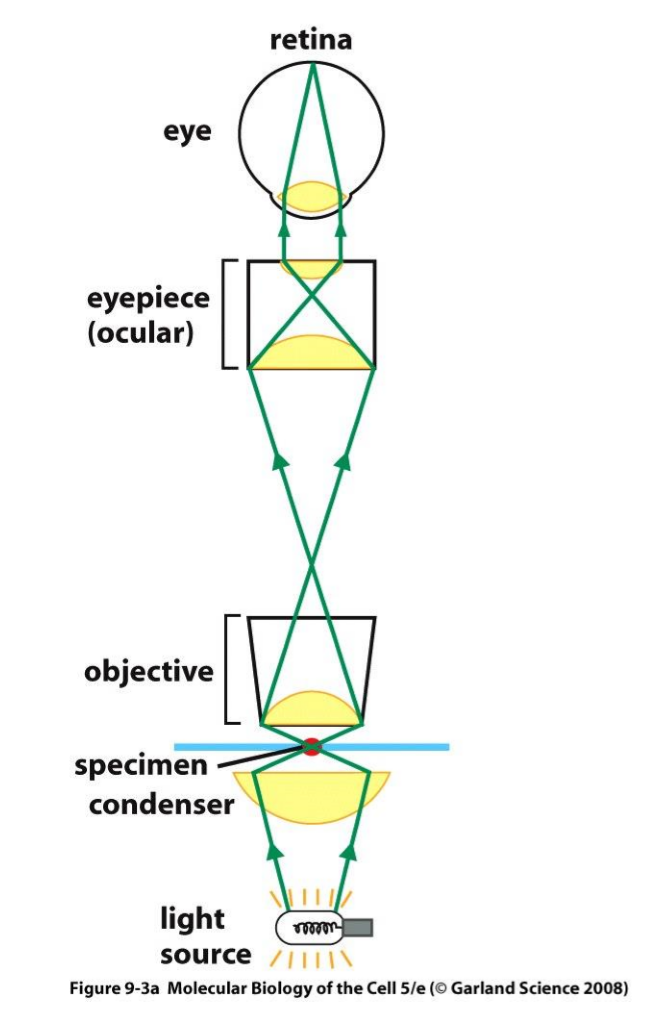 Draw a diagram of how a light microscope works.