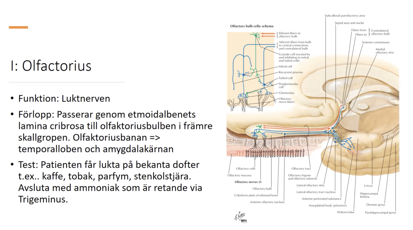 Vilken nerv är kranialnerv 1? Hur löper den? Hur testar man den?