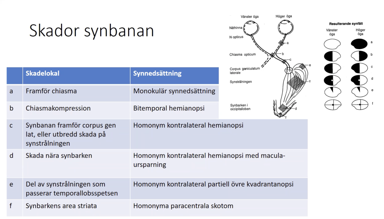 Skada: Man förlorar olika synfält beroende på vart skadan sitter. Titta igenom bilden nogrant.
