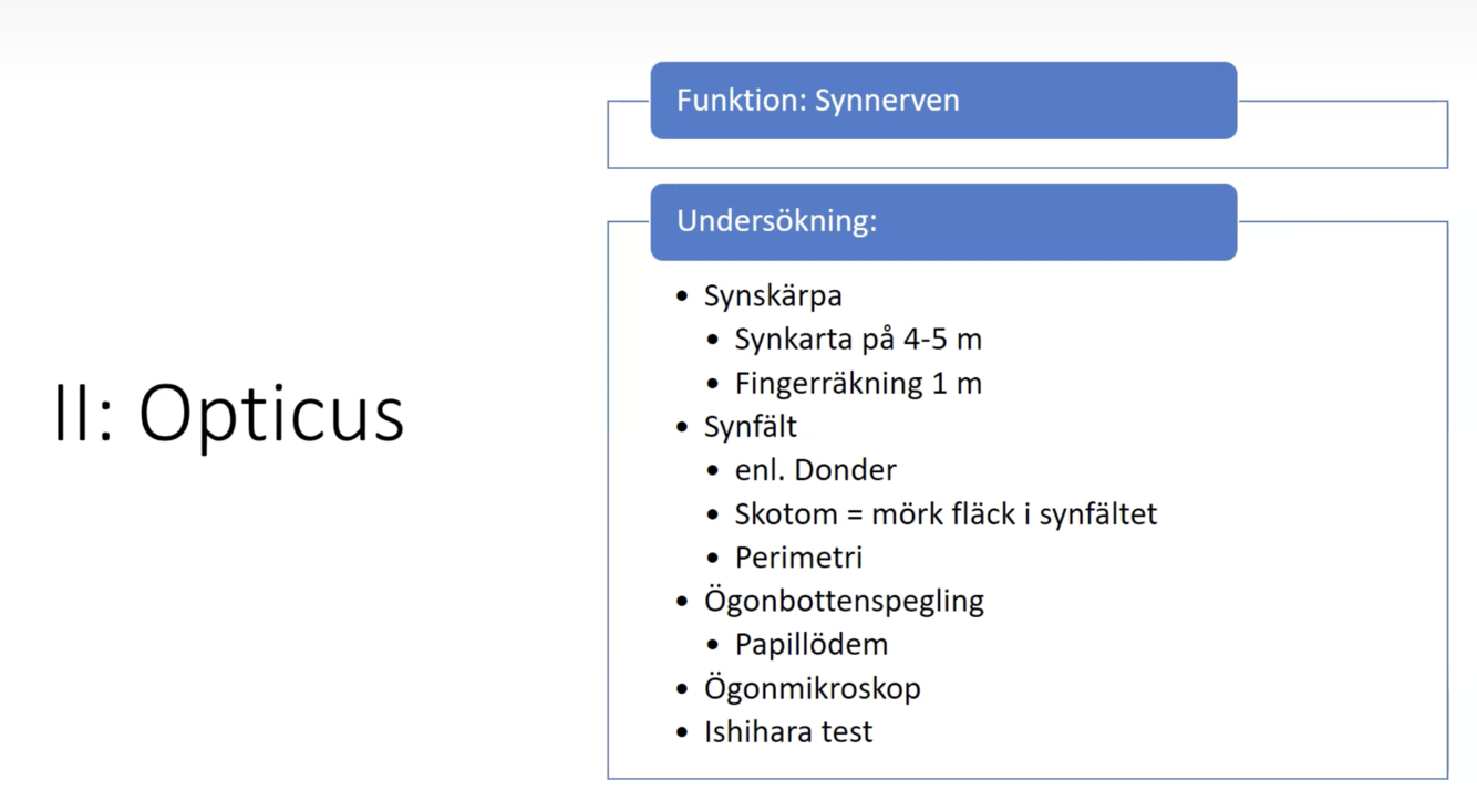 Vilken nerv är kranialnerv 2? Hur löper den? Hur kan synfält påverkas utefter olika skadoplatser av nerven?