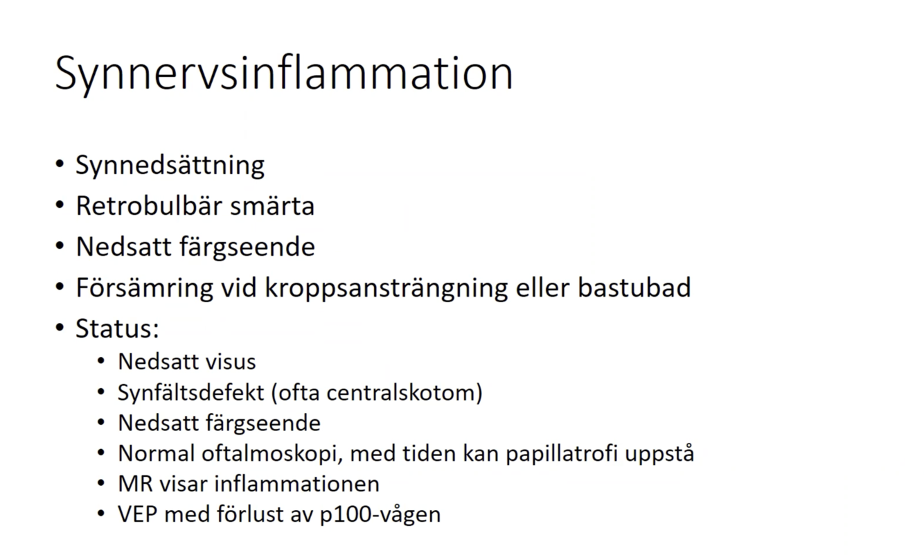 Synnedsättning, ont retrobulbärt, nedsatt färgseende och försämring vid kroppsanstränigning eller bastubad (värmen).
