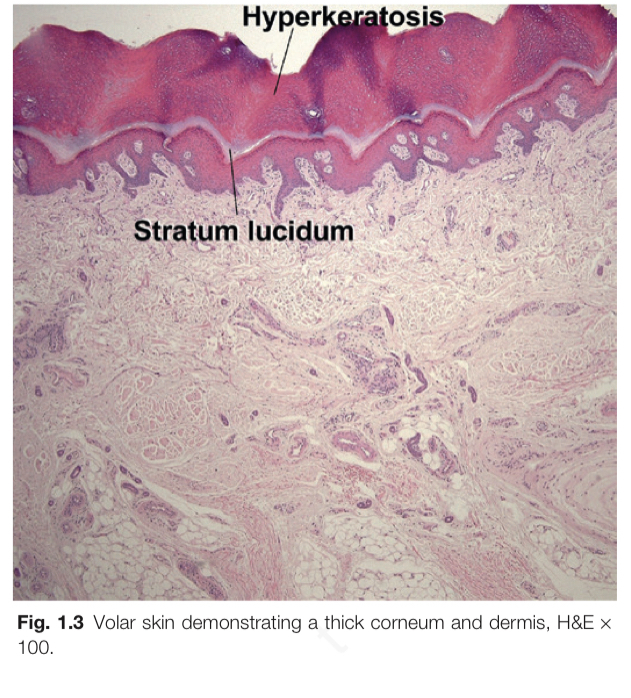 deepest portions of the rete, especially on palmoplantar skin, as well as the hair bulge