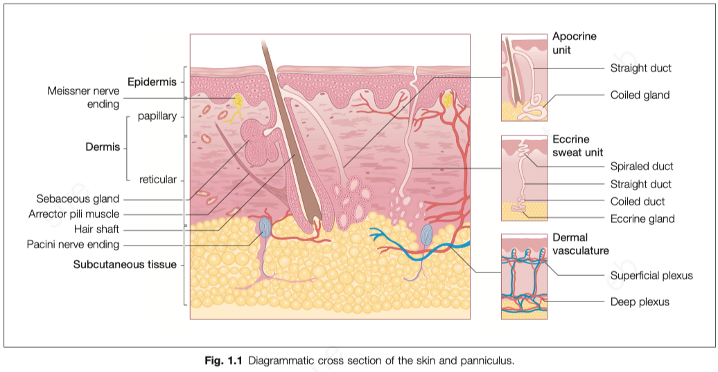 The outermost layer, the epidermis, is composed of viable keratinocytes covered by a layer of keratin, the stratum corneum. The principal component of the dermis is the fibrillar structural protein collagen. The dermis lies on the panniculus, which is composed of lobules of lipocytes separated by collagenous septa that contain the neurovascular bundles.