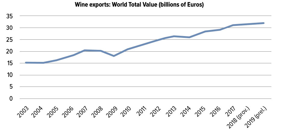 Global wine exports have more than doubled since 2003, from around €15 billion to over €30 billion, despite minor dips here and there, e.g. 2008 global recession.