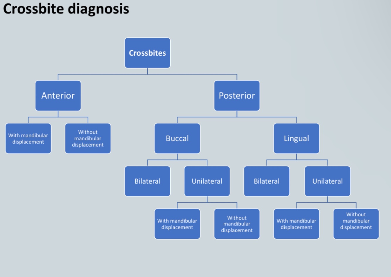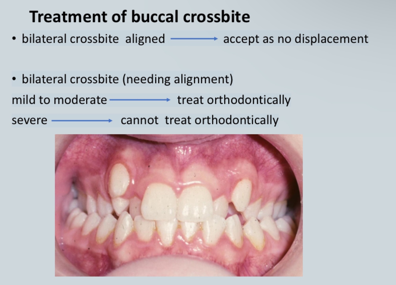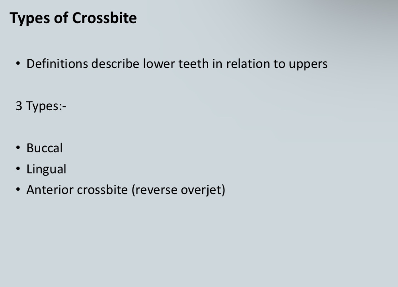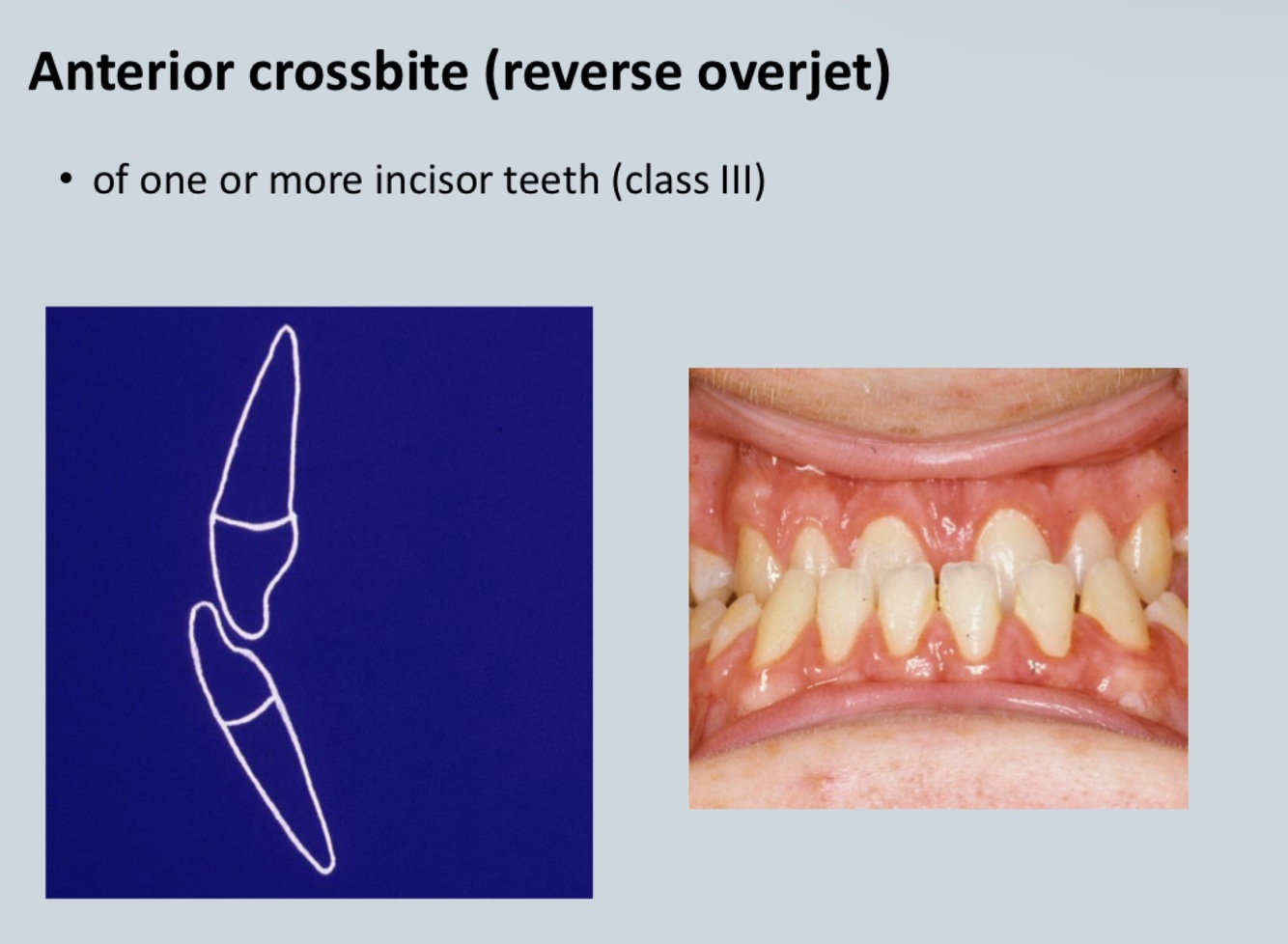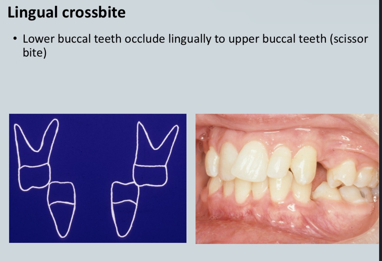 • Crossbite - transverse discrepancy in tooth relationship
