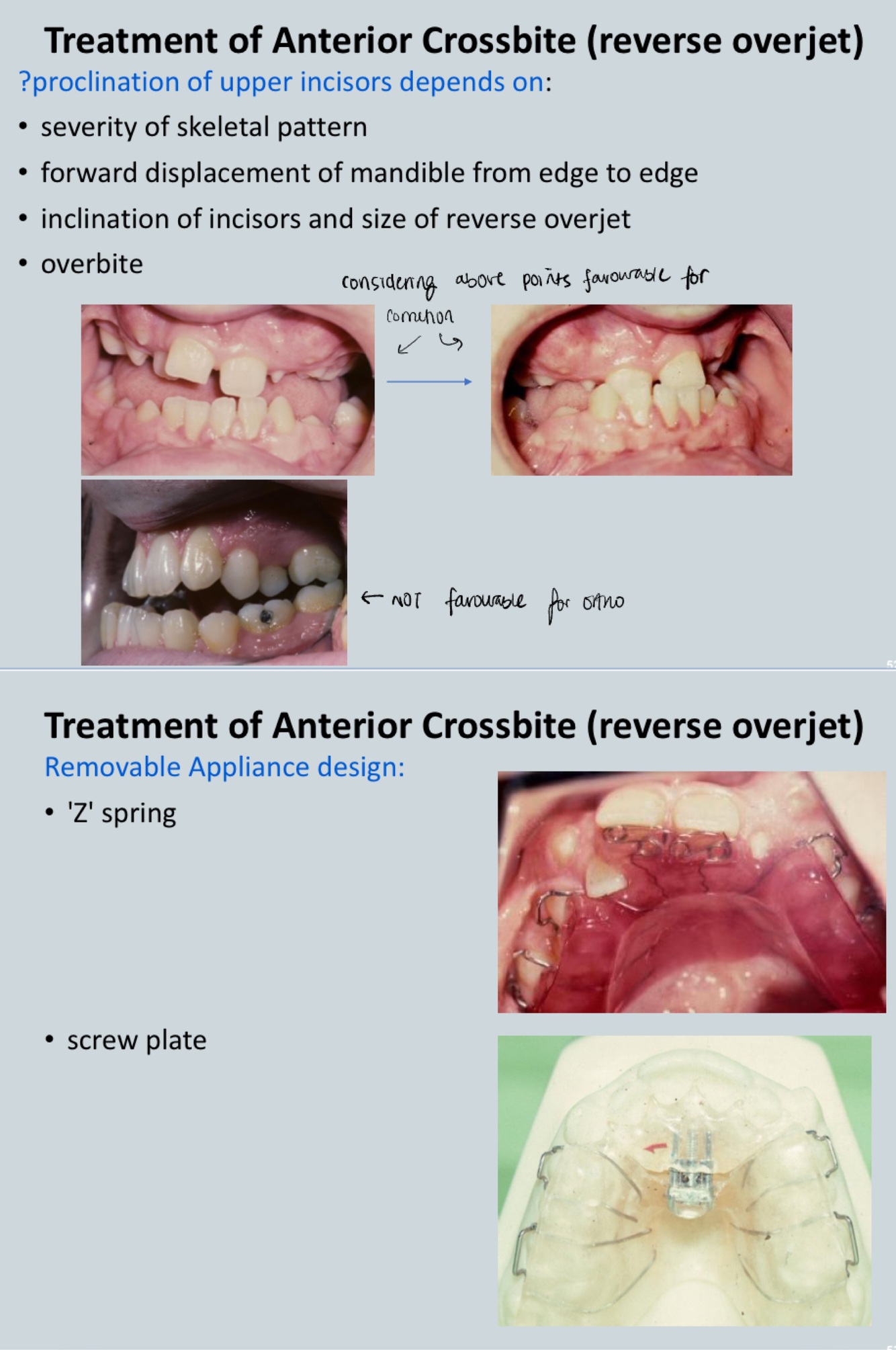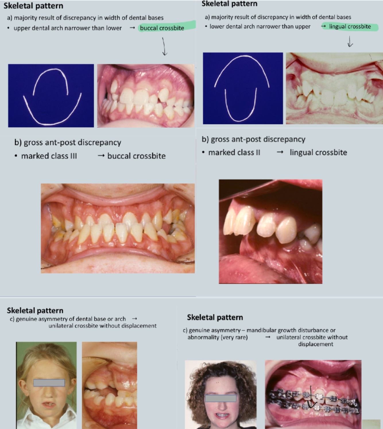 - Dental base asymmetry -> investigate - growth abnormality? Surgery needed?