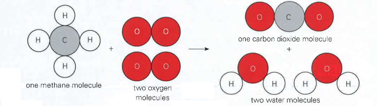 methane + oxygen —–(heat)—–> carbon dioxide + water