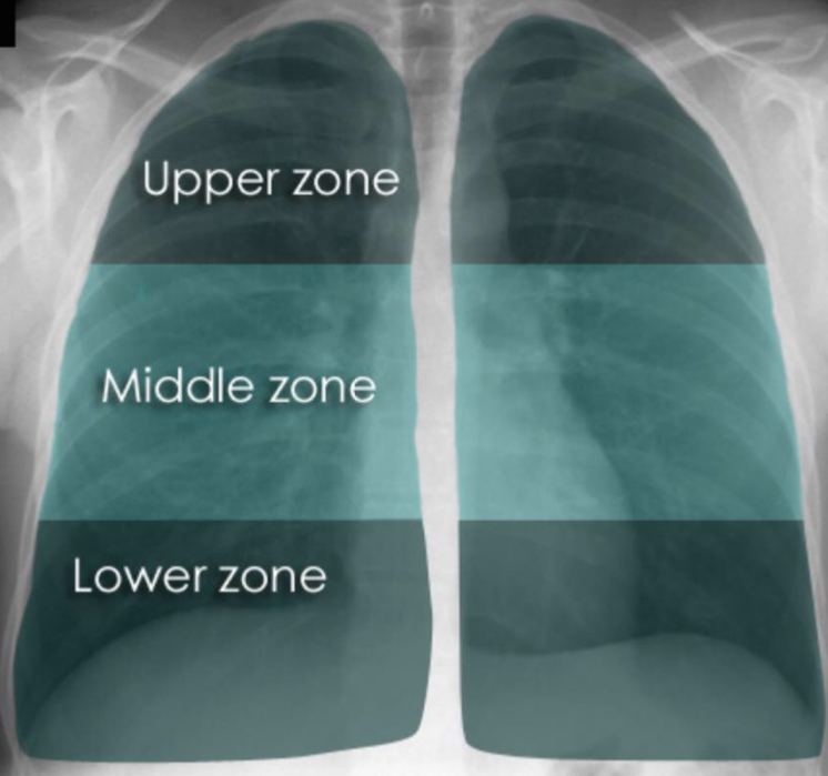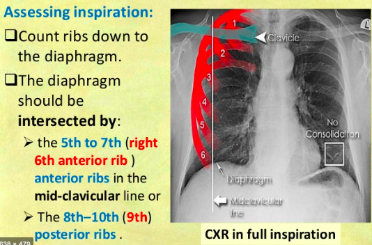 How much lung volume should you see on an inspiration phase chest x-ray?